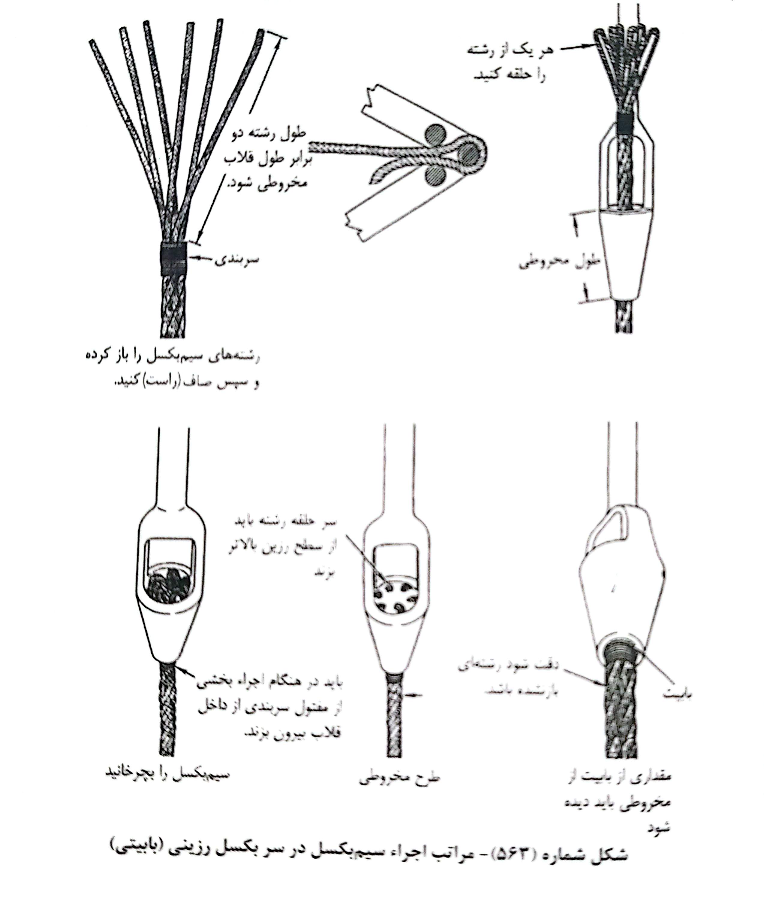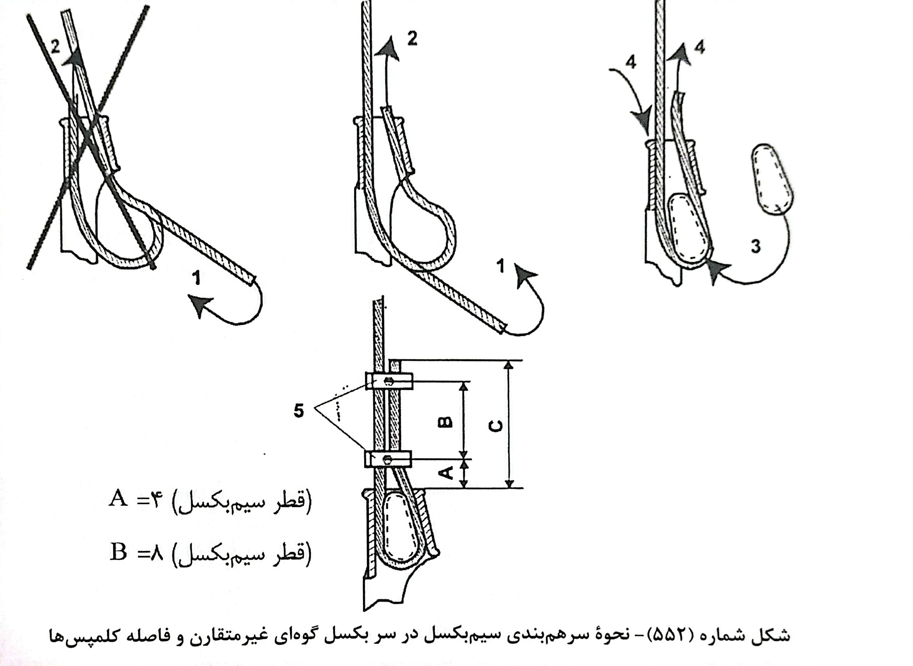 اتصال و سربندی انتهای سیم بکسل ها در سر بکسل های فوق باید در حین نصب و پس از ان کاملا کنترل شود تا در صورت هر گونه تخریب در سیم بکسل و یا ترکیدگی در سطح بدنه ی گوه از محکم بودن پیچ بست ( کلمپس ها) اطمیان حاصل کرد.
